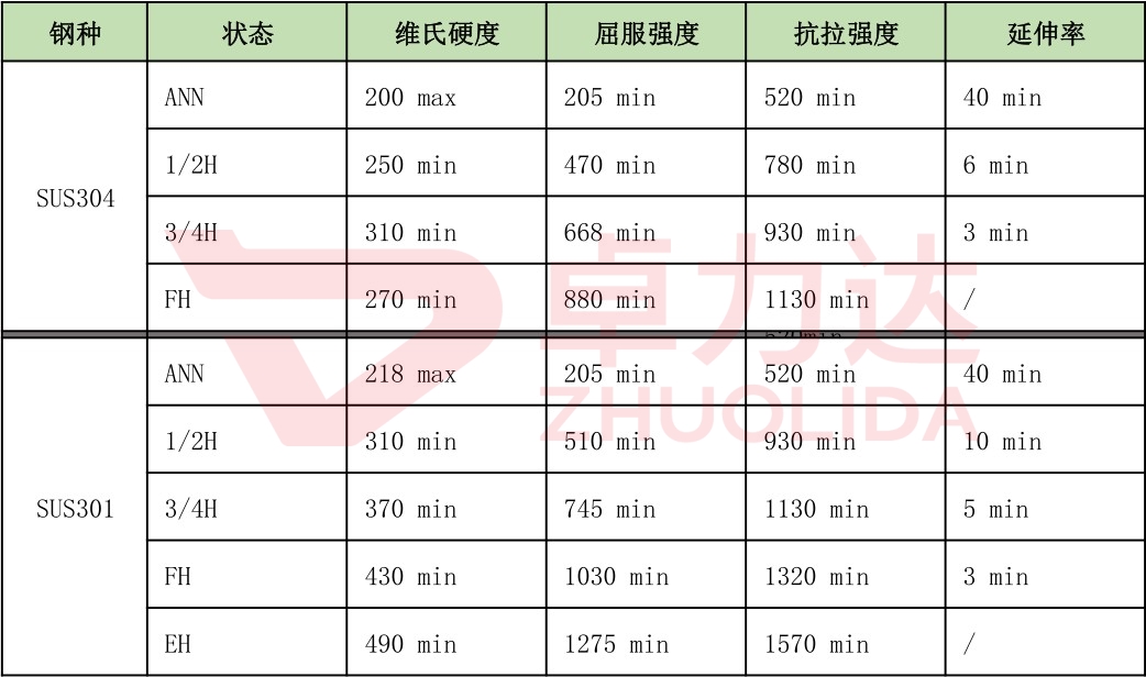金屬蝕刻 材料SUS304 SUS301 不同狀態下的機械性能
