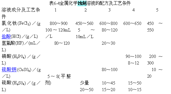 蝕刻不同的金屬要采用不同的溶液配方及工藝條件,常用金屬材料的蝕刻溶液配方及工藝條件見表6—4~表6-6。