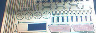 能制出很細致的細部線條,比較適合超細部的表現,但因其硬度高,所以在切割及加工時較麻煩,而且無法用一般的烙鐵來焊接組合。銅的外觀不及不銹鋼的亮麗,但硬度低,很容易加工,可以用一般的烙鐵來焊接組合。左上為AFV CLUB的M-88回收戰車的不銹鋼材質細部零件,可注意它的網目有多么細。左下為TAMIYA的不銹鋼材質[ 工具 ],可用它來刮出戰車表面的防磁紋構造。右邊為STENCILIT的銅材質[ 噴漆型板 ],可用來噴出各種圖案。由這三個產品來看,蝕刻片不光是用在細部零件用途上而已,現已有更多的輔助工具是利用它的特性所制成。