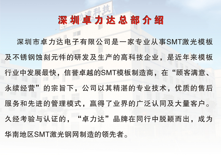 深圳市卓力達電子有限公司是成立于1999年,卓力達人專注于不銹鋼精密蝕刻元件和SMT激光模板的高端技術研發和工藝創新及生產,最近年來蝕刻行業中迅猛的發展,信譽卓越的SMT模板制造商,在“顧客滿意、永續經營”的宗旨下,公司以其精湛的專業技術,優質的售后服務和先進的管理模式,贏得了業界的廣泛認同及大量客戶。久經考驗與認證的,“卓力達”品牌在同行中脫穎而出,成為華南地區SMT激光鋼網制造的領先者。