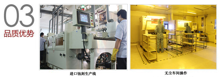 公司設立在深圳特區(qū),建筑面積6000多平方米,擁用現(xiàn)代化廠房以及一流的生產(chǎn)和實驗、檢測設備。關鍵設備包括:進口蝕刻生產(chǎn)線,恒溫恒濕無塵操作間,曝光機,顯影機,二次元測量儀,自動脫膜生產(chǎn)線等。